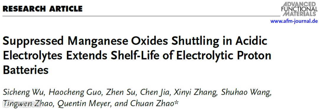 近日,新南威尔士大学的赵川教授课题组在国际知名期刊Advanced Functional Materials 上发表题为“Suppressed manganese oxides shuttling in acidic electrolytes extends shelf-life of electrolytic proton batteries”的研究文章。该文章研究了在不同条件下MnO2 的电解行为,讨论了MnO2-质子电池中的自放电机理,并且展示了一种膜辅助的保护策略,限制电解液中MnO2 颗粒的自由穿梭,以实现长循环低自放电的水系质子电池。