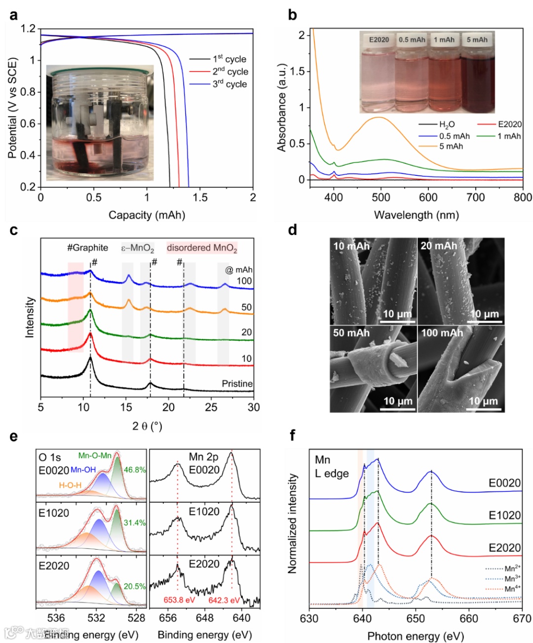 图1. 电解过程中MnO2 产物的扩散和表征。(a)MnO2/Mn2+半电池的恒流充放电曲线。(b)E2020电解液经不同容量充电后的UV-vis结果和照片。经不同容量充电后的碳毡基底的(c)同步辐射XRD和(d)SEM 图像。在不同酸度电解液中沉积的碳毡基底的(e)XPS 和(f)Mn L边sXAS 结果。