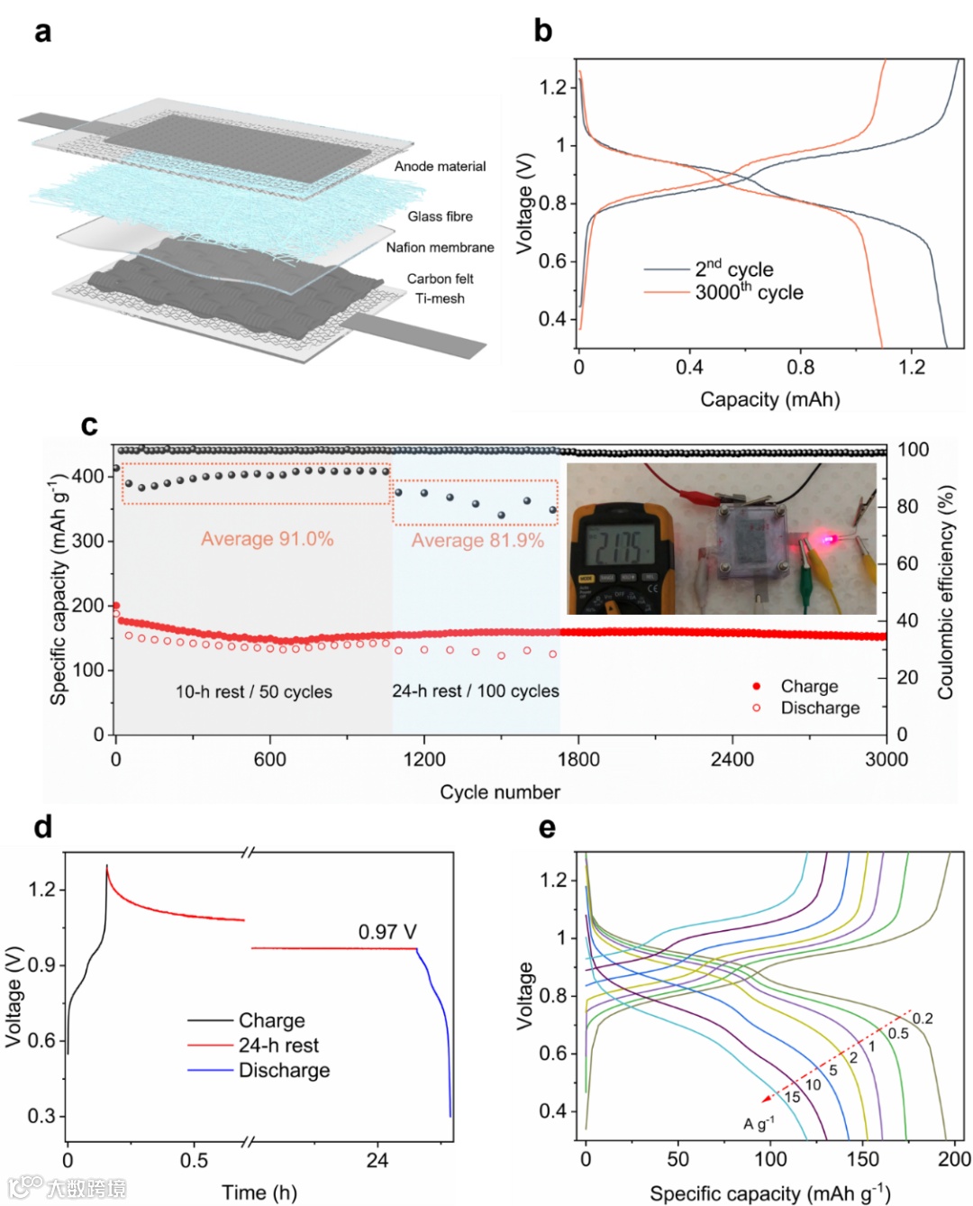 图4. PTO//MnO2全电池器件的电化学性能。堆叠式PTO//MnO2全电池器件的(a)示意图,(b)电压-容量曲线,(c)循环稳定性,(d)24小时自放电测试和(e)倍率测试。