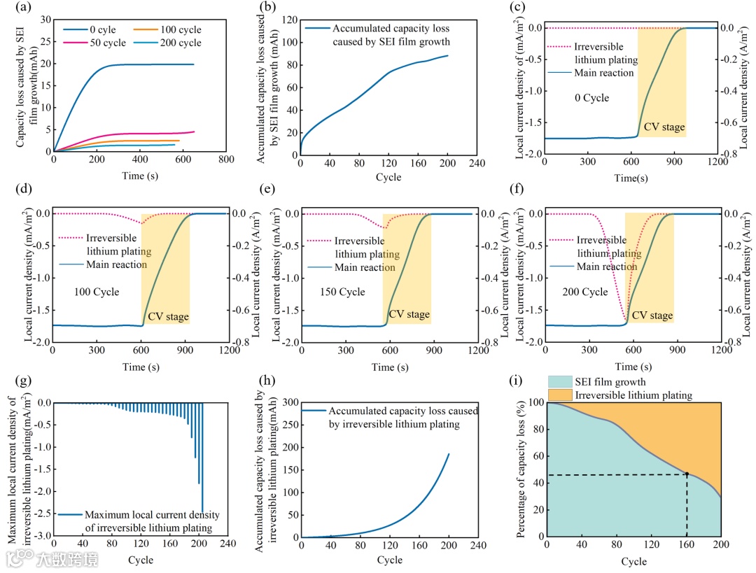 图4非线性衰减过程的仿真分析。(a) SEI膜生长引起的单循环容量损失;(b) SEI膜生长造成的容量损失积累;(c)–(f) 在0、100、150和200次循环时,不可逆析锂副反应和主反应的局部电流密度;(g) 不可逆析锂副反应局部电流密度的演化过程;(h) 由不可逆析锂副反应引起的累积容量损失;(i) 由两种副反应引起的容量损失的百分比分布。