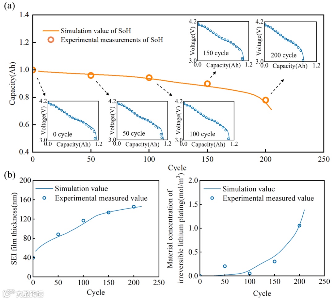 图3 容量、放电电压和副反应的实验与仿真结果比较。(a) 0、50、100、150、200循环时容量衰减曲线和放电电压曲线;(b) SEI膜厚度和不可逆析锂物质浓度。