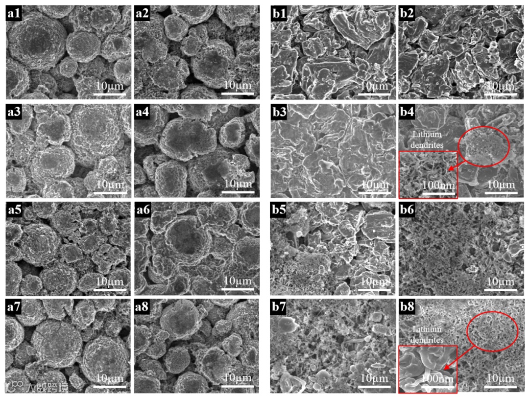 图1 G1组阴极和阳极的SEM图像。(a) 不同循环圈数下阴极SEM图像,编号1-8分别对应于拆解顺序;(b) 不同循环圈数下阳极SEM图像,编号1-8分别对应于拆解顺序。