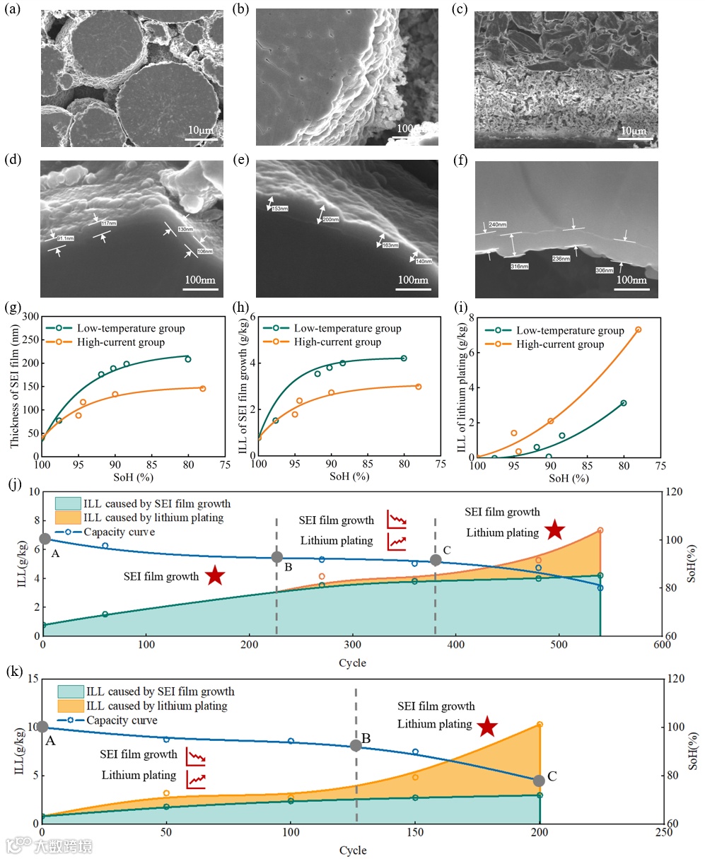 基于对低温和大电流两种极端工作条件下电池循环衰减的机理分析,表明电池非线性衰减的主要原因是衰减后期不可逆析锂副反应速率的指数级增加导致,而SEI膜在衰减后期的厚度几乎不再增加。不可逆析锂及其持续加速导致的不可逆锂离子的大量损失最终导致电池容量的快速衰减和电池容量的跳水行为。