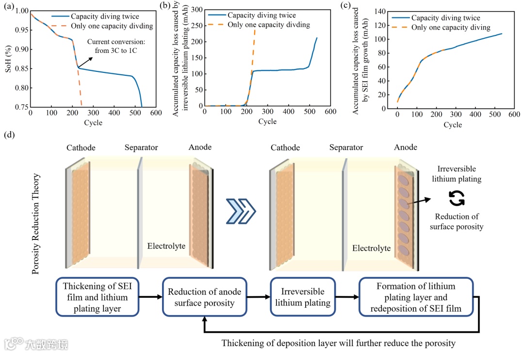 图5 二次容量跳水仿真结果。(a) 二次容量跳水的容量衰减仿真曲线;(b) 二次容量跳水和单次容量跳水的由SEI膜生长引起的累积容量损失比较;(c) 二次容量跳水与单次容量跳水不可逆析锂引起的累积容量损失比较;(d) 孔隙率下降理论。