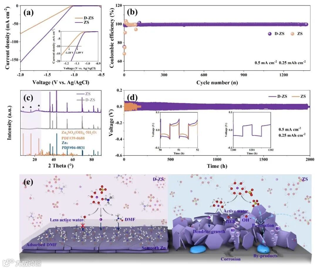 图4 (a) ZS和D-ZS电解液中的LSV曲线;(b) 使用ZS或D-ZS作为电解液的Zn||Cu在0.5 mA cm-2下的循环性能;(c) 沉积容量为5 mAh cm-2的Zn电极在ZS和DZS电解液中的XRD图谱;(d) Zn||Zn对称电池在0.5 mA cm-2下的循环性能;(e) ZS和D-ZS电解液基本机理示意图。