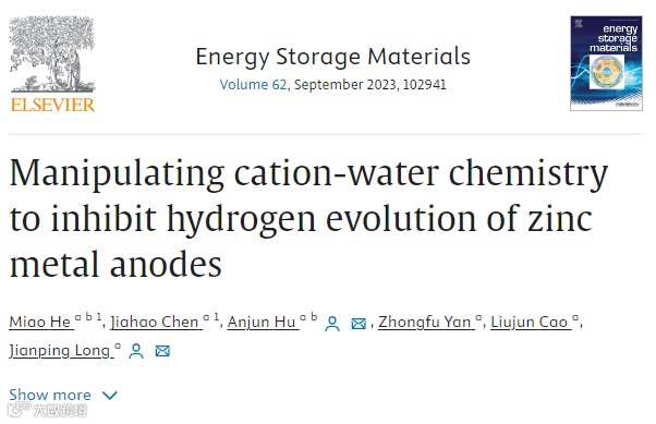 M. He, J. Chen, A. Hu*, Z. Yan, L. Cao, J. Long*, Manipulating cation-water chemistry to inhibit hydrogen evolution of zinc metal anodes, Energy Storage Mater. 2023, 62, 102941.
