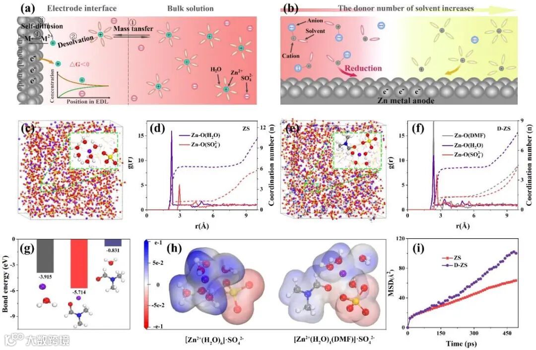 图1 (a) Zn2+自发逃逸和沉积的过程示意图。(b)锌离子配位原理示意图。(c) ZS 和 (e) D-ZS 电解液体系的MD快照。(d) ZS 和 (f) D-ZS 电解液体系的 RDF 和配位数。(g)Zn2+、DMF和H2O之间的结合能。(h) [Zn2+(H2O)6]·SO42- 和 [Zn2+(H2O)4(DMF)]·SO42- 的静电势图。(i) MSD 在 ZS 和 D-ZS 电解液下随时间变化。