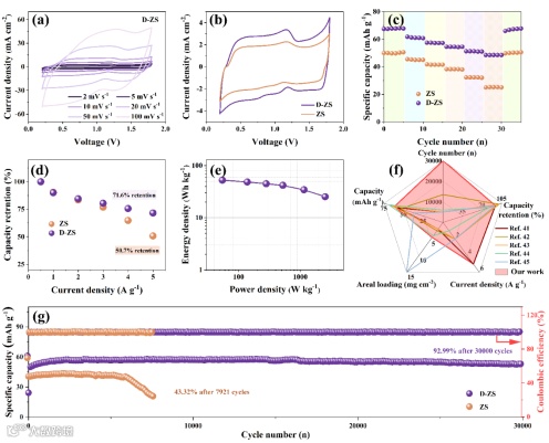 图5 (a) 不同扫描速率下D-ZS基ZHSCs的CV曲线。(b) D-ZS基ZHSC和ZS基ZHSC在5 mV s-1扫速下的CV曲线。D-ZS基和ZS基ZHSC的 (c) 倍率性能和 (d) 相应的容量保留率。(e) D-ZS ZHSC 的Ragone图。(f) 用于本工作性能比较的雷达图以及ZHSCs重要参数的相关参考文献。(g) D-ZS基ZHSC 和ZS基ZHSC在2 A g-1下的恒电流循环性能。