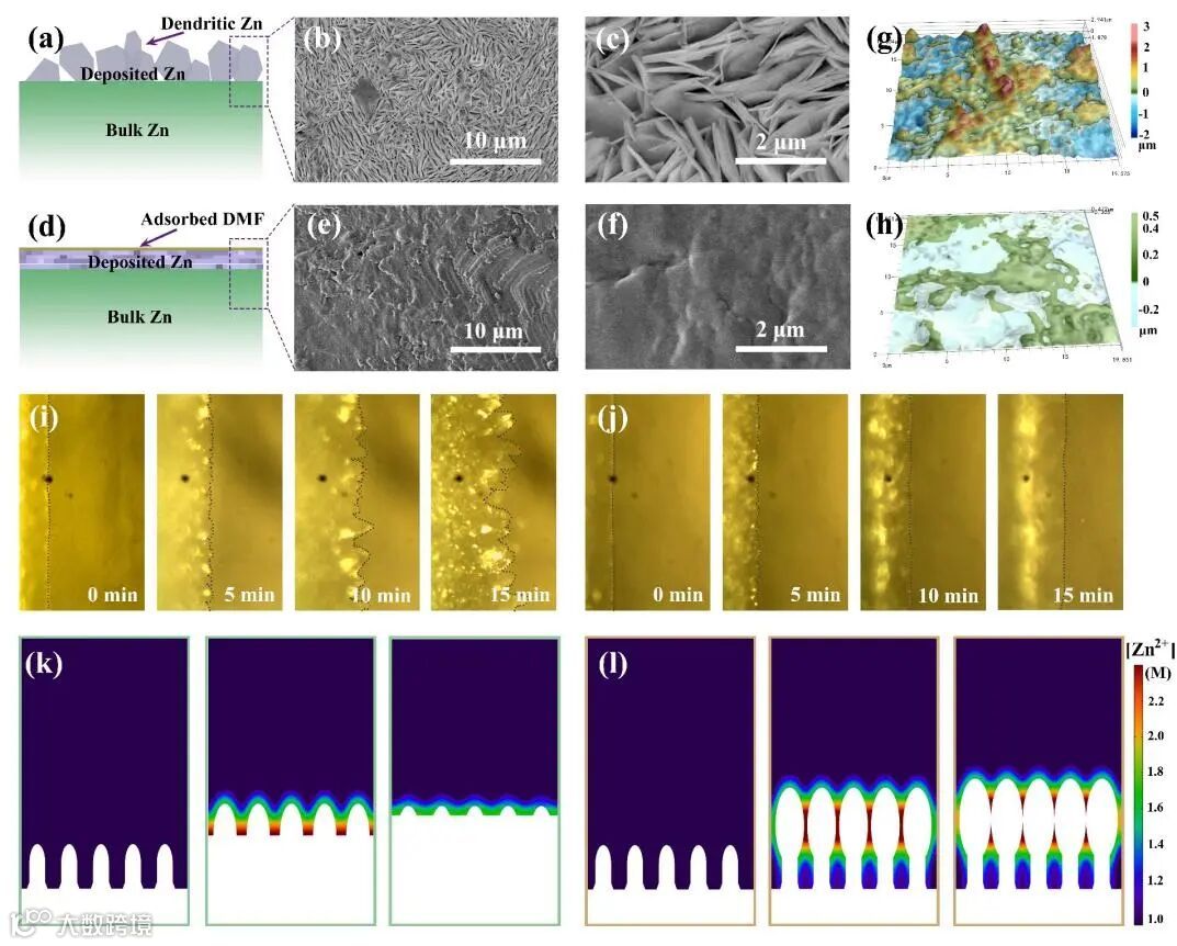 图3 (a)ZS 和(e)D-ZS 电解液中锌沉积的示意图。(b-c) ZS 和 (f-g) D-ZS 电解液中锌沉积的SEM,电镀容量为 10 mA h cm-2。(d) ZS 和 (h) D-ZS 电解液的三维激光显微镜图像。在 (i) ZS 和 (j) D-ZS 电解液中锌负极上电镀锌的原位光学图像。COMSOL 模拟在 (k) D-ZS 和 (l) ZS 电解液下 0 秒、300 秒和 600 s(从左到右)的镀锌过程。