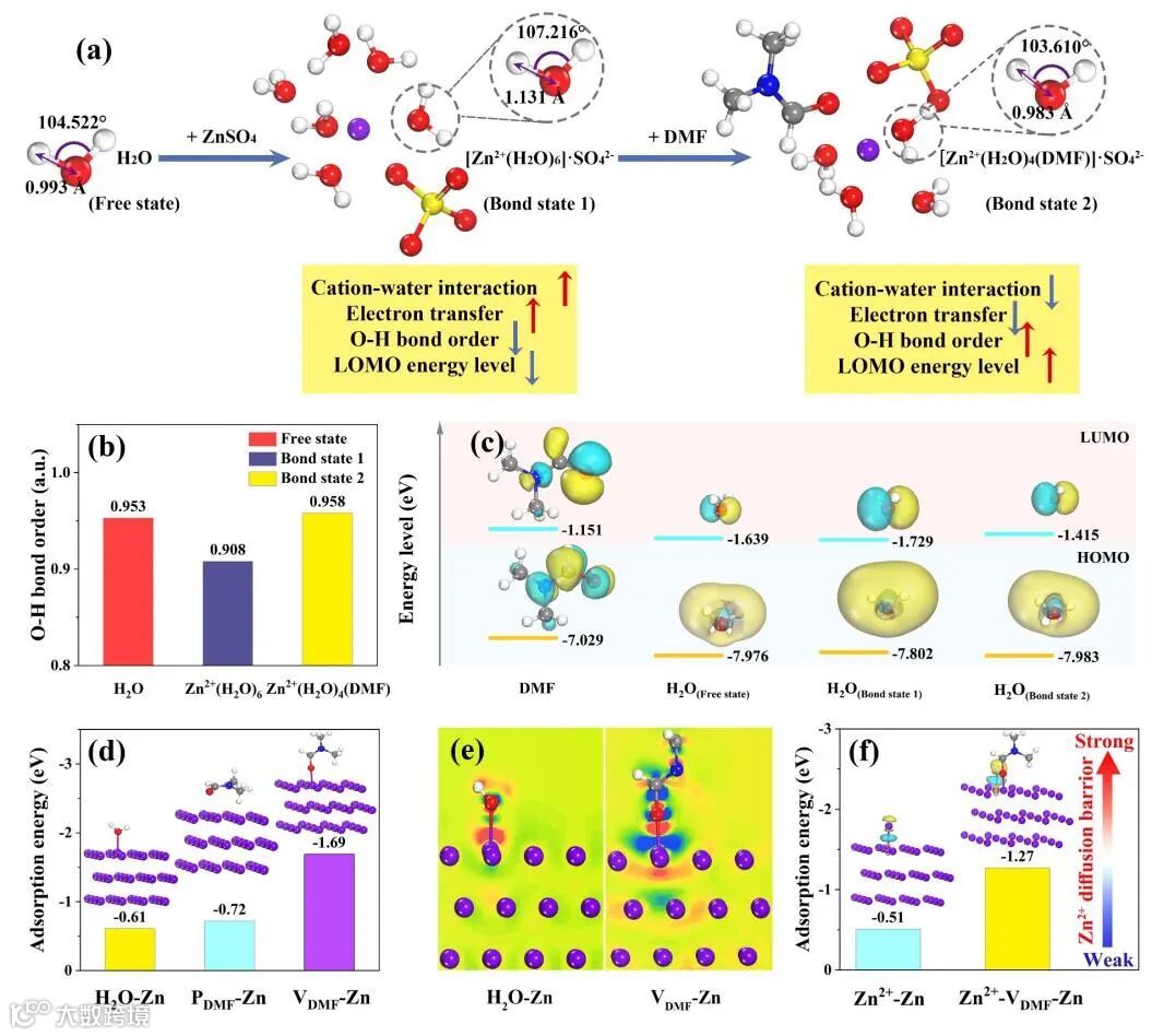 图2 (a) 基本模型和DFT计算结果。(b) 不同状态下 H2O的 O−H 键序。(c) DMF分子和H2O分子在不同状态下的HOMO和LUMO。(d) H2O和DMF在Zn(002)晶面上的吸附能,插图显示相应的吸附模型。(e) VDMF/H2O分子和 Zn (002) 之间差分电荷密度的切片二维等值线图。(f) Zn2+在Zn(002)和V-DMF/Zn(002)上的吸附能,插图显示相应吸附模型的差分电荷密度。