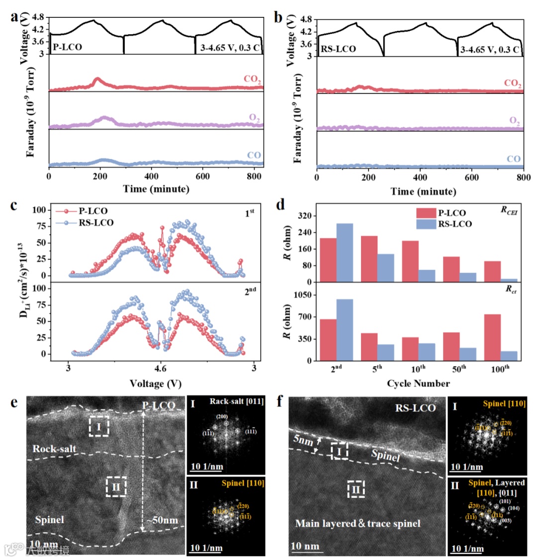气体释放可以作为评价界面副反应的指标。原位电化学质谱(DEMS)测试用于探测LCO/Li电池在最初三个循环中在3-4.65 V和0.3 C下的气体释放(图5a,b)。RS-LCO/Li电池的气体释放量明显低于P-LCO/Li电池,说明副反应较少,伴随着CEI的优化,使其能够在循环过程中快速、稳定地嵌入/脱出Li+,计算的Li+扩散系数(DLi+)表明,在第一次充电过程中,RS-LCO的DLi+值明显低于P-LCO,这主要是由于表面盐岩层的缺Li+特性造成的,而在第一次放电过程和第二次循环中,RS-LCO的DLi+值明显变高,说明由于成功的“盐岩到尖晶石”转变而增强了Li+离子在整个表面上的扩散动力学。