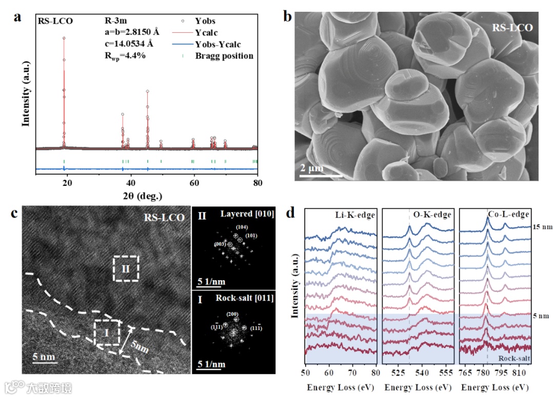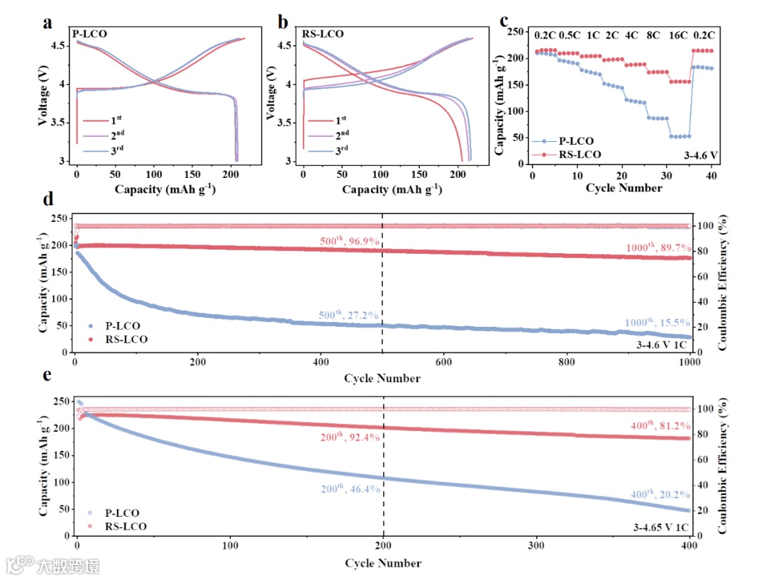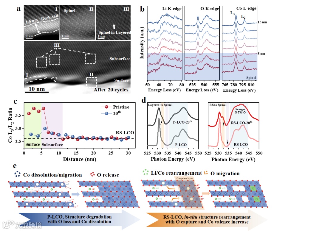 此外,rs-lco在535-545="" ev范围内的特征峰更宽、更高,这很好地对应了较强的o2="" p-tm="" 4s="" 4p相互作用,有利于形成更稳定的o骨架。总的来说,rs-lco表面上缺li的盐岩相在充电时,li+离子穿过该层带来额外的li+离子,并从亚表面区域捕获了迁移的o,将co价态从co="" 2="" +="" 3+增加到co="" 3="" 4+,这种从盐岩到尖晶石的相变是一个渐进的过程,经过一定的循环,表面上的所有盐岩相都转变为尖晶石相。这种特殊的反常相变使rs-lco的循环和倍率性能得以增强。<="" p="">