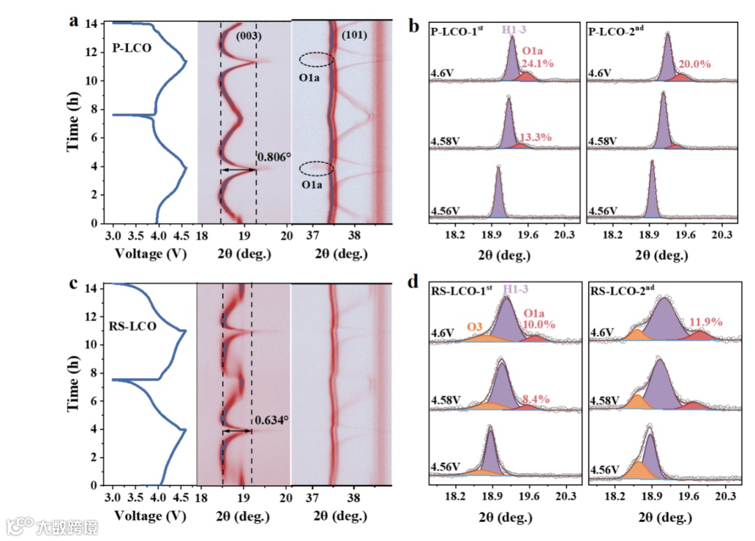 对于体相结构,当充电到4.55 V以上时,O3/H1-3相变发生,伴随着晶格体积收缩,内应力和微裂纹的产生,最终导致相结构的坍塌。因此,抑制不可逆O3/H1- 3相变是提高LCO循环稳定性的关键,利用原位XRD揭示了原始LCO(P-LCO)和RS-LCO的相演变过程。通常(003)峰的位移(Δ 2Θ)代表Co-O层的层间距变化。作为比较,P-LCO和RS-LCO的Δ 2Θ值分别为0.806°和0.634°,表明RS-LCO的晶格变化受到抑制。当充电到4.6 V时,RS-LCO观察到较少的O 1a相(H1-3内部分离的O 1相),而对于P-LCO,O 1a相的产生明显出现,表明P-LCO中更多的H1-3分离。当充电电压超过4.56V时,(003)峰可以分成位于18.6°、19.0°和19.6°处的O3、H1-3和O1a相。