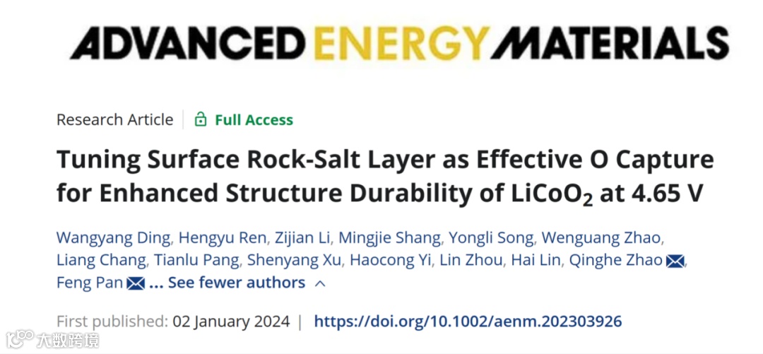 W. Ding, H. Ren, Z. Li, M. Shang, Y. Song, W. Zhao, L. Chang, T. Pang, S. Xu, H. Yi, L. Zhou, H. Lin, Q. Zhao, F. Pan, Tuning Surface Rock-Salt Layer as Effective O Capture for Enhanced Structure Durability of LiCoO2 at 4.65 V. Adv. Energy Mater. 2024, 2303926.