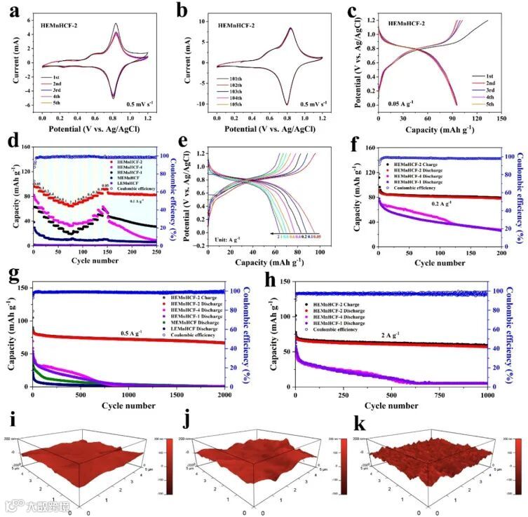 图2.(a)初始五个循环的CV曲线和(b)HEMnHCF-2的100个循环后的CV曲线。(c)HEMnHCF-2的充放电曲线。(d)HEMnHCF-2的倍率能力。(e)HEMnHCF-2在0.05~2 A g−1范围内的充放电曲线。(f)0.2 A g−1,(g)0.5 A g−1和(h)2 A g−1的循环性能。在2 A g−1下2000次循环后,(i)HEMnHCF-2、(j)HEMnHCF-1和(k)HEMNHICF-4的电极表面的AFM图像。
