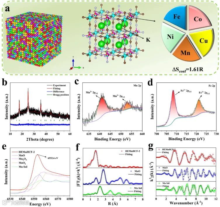 图1.(a)HEMnHCF-2的示意图。(b)HEMnHCF-2的XRD图谱和Rietveld精修结果。HEMnHCF-2的(c)Mn 2p(d)Fe 2p XPS拟合光谱。(e)Mn K边XANES和(f,g)HEMnHCF-2的EXAFS光谱。