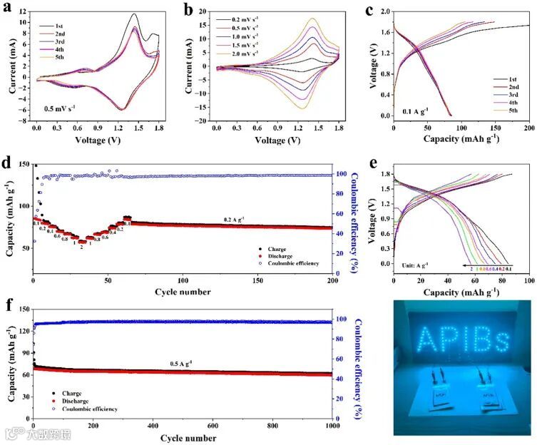 图5. HEMnHCF-2/PNTCDA全电池的电化学性能。(a)0.5 mV s−1和(b)0.2-2 mV s−1的CV曲线。(c)0.1 A g−1时的充放电曲线。(d)倍率性能和(e)在全电池的不同电流密度下的相应充放电曲线。(f)在0.5 A g−1下的循环性能。(g)HEMnHCF-2//PNTCDA软包电池为LED面板供电。