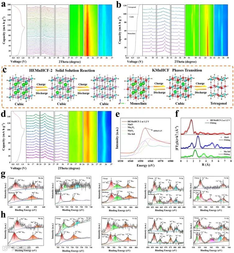 为了深入了解HEMnHCF中的电荷补偿机制,我们在HEMnHCF-2的完全充电状态下进行了非原位Mn K边XANES(图3e)。当HEMnHCF-2被充电到1.2 V时,Mn K边XANES光谱向更高的能量移动约1.9eV,但没有到达Mn3+的位置,表明Mn2+被氧化到+2和+3的中间价态。此外,还对HEMnHCF-2(图3g)和HEMnHCF-4(图3h)在完全充电和放电状态下进行了非原位XPS,以证明上述结果。