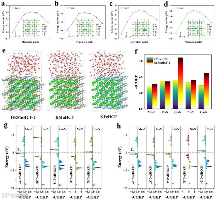 图4.(a-d)HEMnHCF-2内的四种K扩散途径。(e)HEMnHCF-2、KMnHCF和KFeHCF的MD模拟。(f)各种键的积分晶体轨道Hamilton布居值。(g)HEMnHCF-2和(h)KMHCF的各种键的COHP和ICOHP。