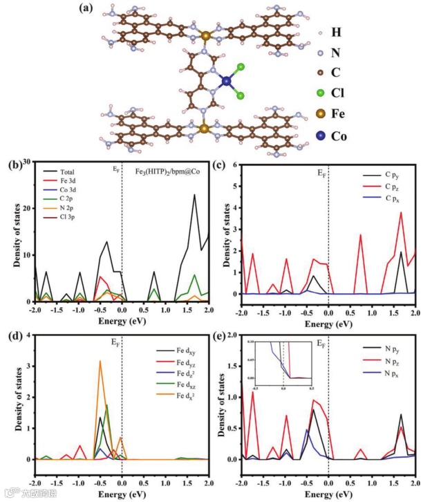 图4.(a)Fe3(HITP)2/bpm@Co的化学结构;Fe3(HITP)2/bpm@Co的(b)TDOS(c-e)PDOS。