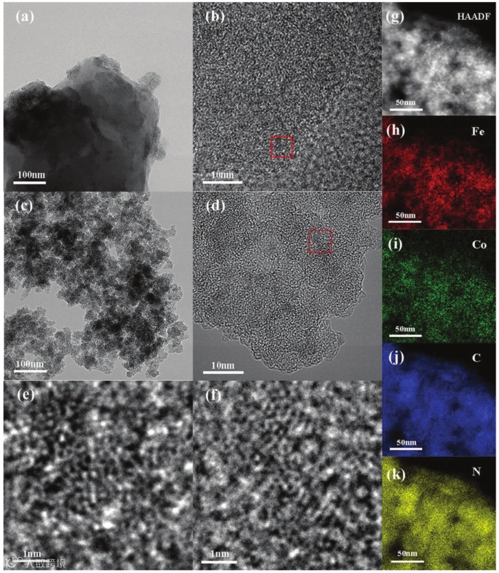 图1. Fe3(HITP)2,Fe3(HITP)2/bpm@Co的TEM图像及Fe3(HITP)2/bpm@Co的元素分布。