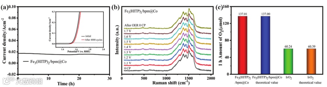 以1 M KOH为电解液,对Fe3(HITP)2/bpm@Co进行了OER测试。极化曲线(LSV)显示,Fe3(HITP)2/bpm@Co的过电位(299mV 10 mA cm−2)相比于Fe3(HITP)2以及Fe3(HITP)2/bpm有明显的提升,与IrO2相当。Fe3(HITP)2/bpm@Co具有更低的Tafel斜率阻抗(EIS)和更高的电化学活性面积(ECSAs),说明了Fe3(HITP)2/bpm@Co具有更优的反应动力学,更低的电荷转移电阻以及更多的电化学活性位点的暴露。另外通过计时电流法及循环伏安法测试了材料的稳定性,在运行OER反应30小时后电流密度仅有少量下降,4000次CV测试后,过电位变化不大,材料具有很好的OER稳定性。另外原位拉曼光谱进一步验证了材料在反应过程中的稳定性。Fe3(HITP)2/bpm@Co上产生的O2气体为137.01 μmol(接近理论产率137.00 μmol),远高于商用IrO2的60.24 μmol(接近理论产率60.39 μmol)。