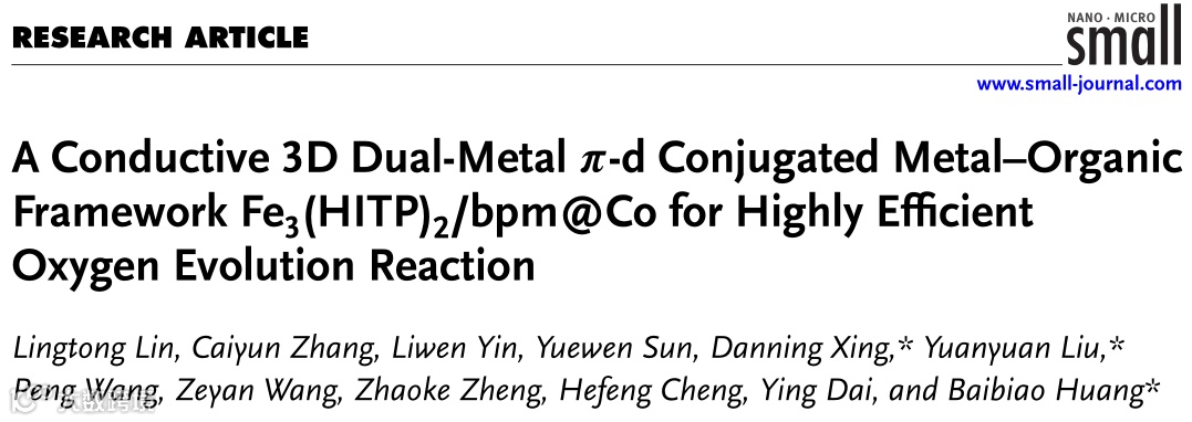 近日,山东大学黄柏标教授、刘媛媛教授和山东高等技术研究院邢丹宁助理研究员,在国际知名期刊Small上发表题为“A Conductive 3D Dual-Metal π-d Conjugated Metal–Organic Framework Fe3(HITP)2/bpm@Co for Highly Efficient Oxygen Evolution Reaction”的文章。该文章通过在二维π-d共轭MOFs材料Fe3(HITP)2的层间插入bpm形成三维结构,同时利用bpm引入Co离子位点。有效提高了材料的比表面积,同时Fe,Co双金属位点的共同作用导致其具有高效的电催化析氧反应(OER)的性能。