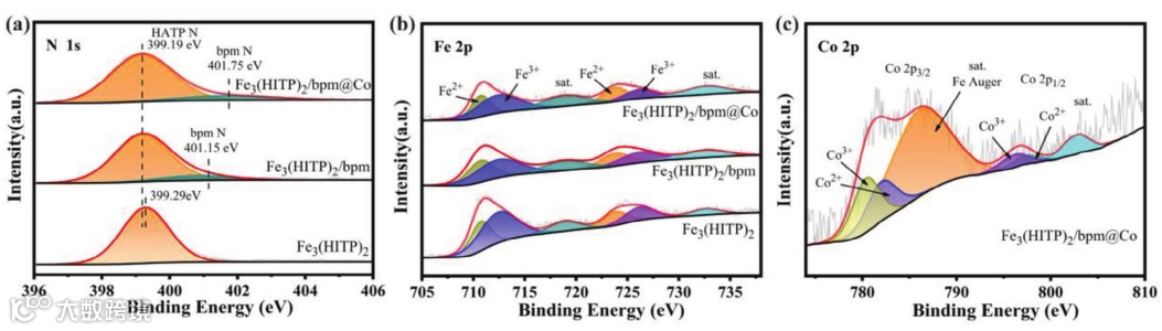 图3. Fe3(HITP)2,Fe3(HITP)2/bpm和Fe3(HITP)2/bpm@Co的XPS谱图。