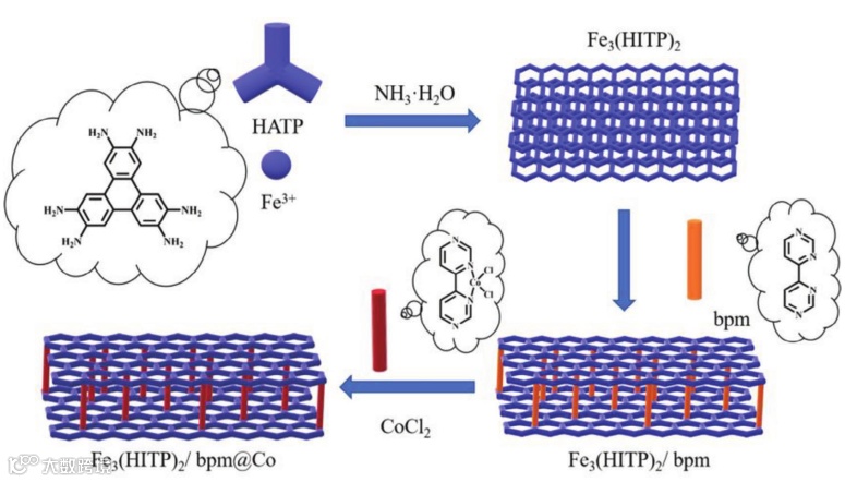 流程图. Fe3(HITP)2/bpm@Co的合成步骤和框架结构。