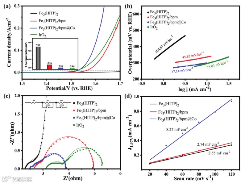图5. Fe3(HITP)2,Fe3(HITP)2/bpm,Fe3(HITP)2/bpm@Co和IrO2的OER性能测试