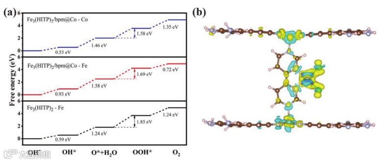 图7. Fe3(HITP)2,Fe3(HITP)2/bpm@Co的OER标准自由能图及Fe3(HITP)2/bpm@Co的差分电荷图。