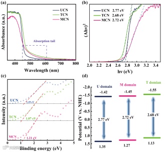 图6. UCN、TCN和MCN的(a)紫外-可见漫反射光谱,(b)禁带计算转换曲线,(c)XPS价带谱,(d)U区域、T区域和M区域的能带分布位置