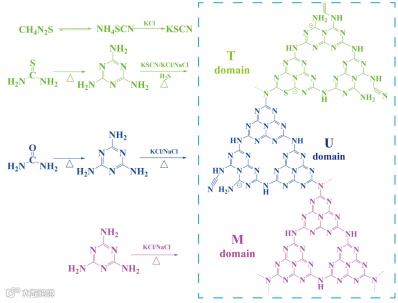 如图2和图3,通过对合成样品的结构和与化学成分分析,可以说明g-C3N4分子间同质结集成了各自单体的结构特性。其中,尿素衍生的U区域具有相对完整的共轭结构以及少量氰基;硫脲衍生的T区域贡献了S掺杂和大量氰基,同时氰基附近的非平衡电荷被K+/Na+配位中和;三聚氰胺衍生的M区域具有典型的melon分子结构以及低的结晶性。由此可以推断这种UTMCN可能的形成过程如图4所示。