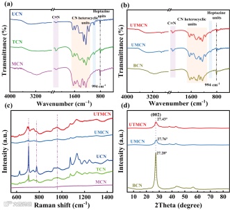 图2.(ab)FTIR图谱,(c)拉曼光谱,(d)XRD图谱