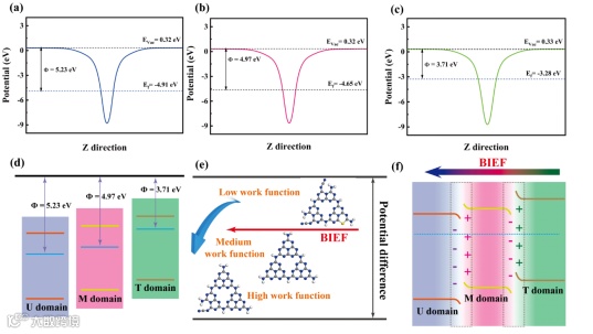 图7.(ac)U区域、T区域和M区域理论功函数,(df)UTMCN内建电场的形成过程