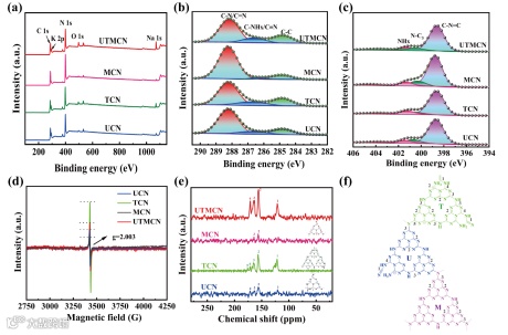 图3. UCN、TCN、MCN和UTMCN的(a)XPS全谱,(b)C 1s高分辨谱,(c)N 1s高分辨谱,(d)EPR,(e)NMR谱图,(f)UTMCN可能的分子结构