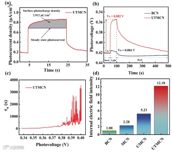 图8.(a)表面光电荷密度,(b)开路电势-时间曲线,(c)平均载流子寿命,(d)内建电场强度