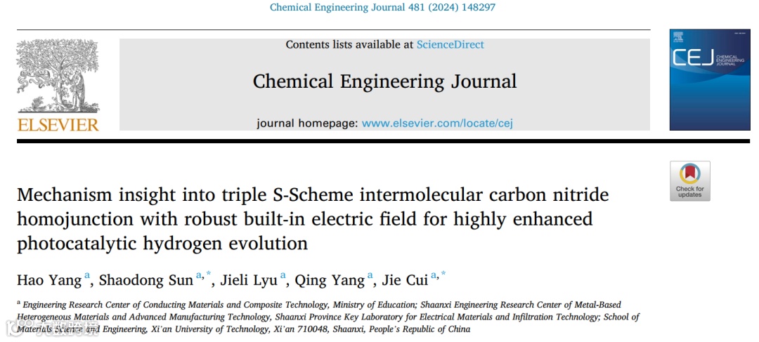 近日,来自西安理工大学材料科学与工程学院的孙少东教授与崔杰高级工程师团队在国际知名期刊Chemical Engineering Journal上发表了题为“Mechanism insight into triple S-Scheme intermolecular carbon nitride homojunction with robust built-in electric field for highly enhanced photocatalytic hydrogen evolution”的研究论文。