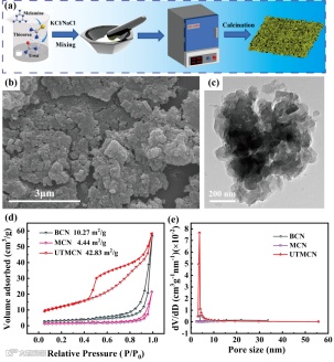 图1. UTMCN的(a)制备流程示意图,(bc)SEM与TEM照片,(de)N2吸附-解吸等温线图与孔径分布曲线