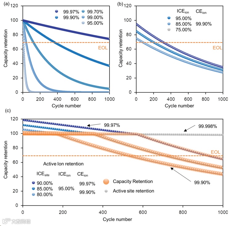 快速的容量损失导致无负极钠电池的循环寿命大大缩减,使其难以走出实验室。作者通过分析无负极钠电池体系中的活性钠离子数量,建立了其循环寿命和库伦效率之间的关系,从而搭建了简化版的寿命模型。其结果显示,提升活性钠离子的循环库伦效率是增加循环寿命的最有效手段。1000圈的循环需要超99.97%的活性离子循环库伦效率,目前还没有研究报道可以达到。其次,减少首次SEI成膜钠离子消耗和额外补充钠离子也是提升循环寿命的有效方法。