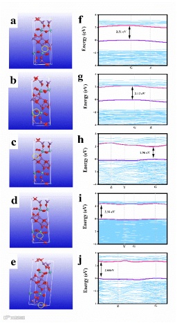 图3. 不同位置空位Bi2MoO6的模型及能带宽度