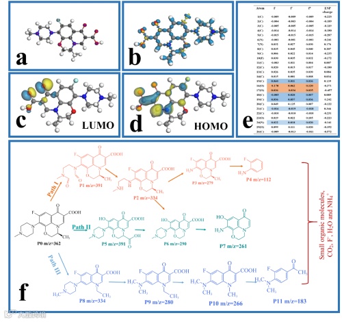 图4. LVX的(a)化学结构, (b)差分电荷的变形密度, (c, d) HOMO和LUMO轨道, (e) f-、f+、f0和ESP指数,(f) 三条可能的降解途径