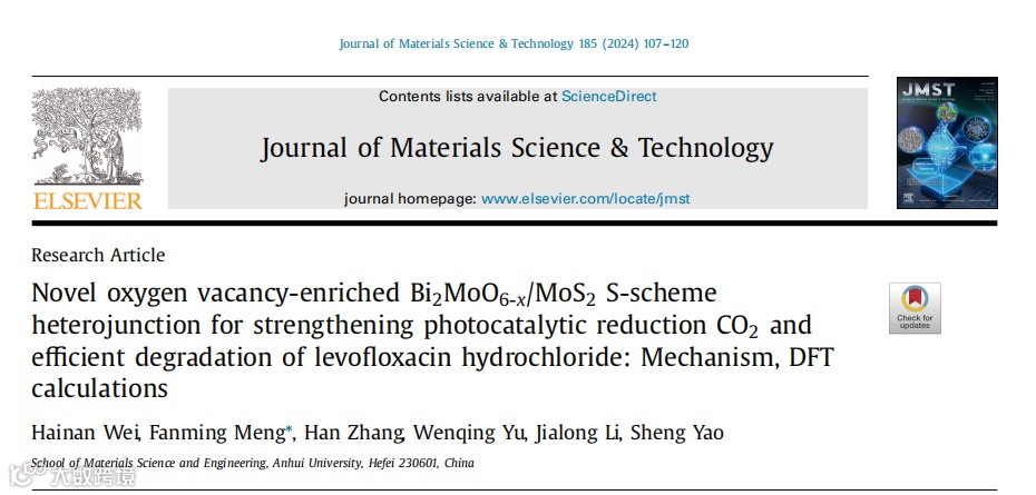 近日,来自安徽大学的孟凡明教授,在国际知名期刊Journal of Materials Science & Technology上发表题为“Novel oxygen vacancy-enriched Bi2MoO6-x/MoS2 S-scheme heterojunction for strengthening photocatalytic reduction CO2 and efficient degradation of levofloxacin hydrochloride: Mechanism, DFT calculations”的观点文章。该观点将表面缺陷应用到催化剂中,在未破坏催化剂形貌的前提下显著增强光催化还原CO2,同时还可以高效降解盐酸左氧氟沙星。