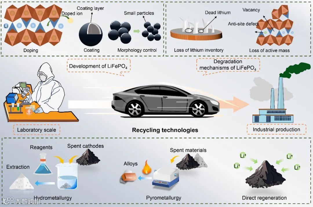 图3. 文章的整体框架:从LiFePO4正极材料的发展与不同降解方式出发,对废旧电池回收所需解决问题、策略进行分析,详细介绍并讨论了湿法冶金、火法冶金与直接再生的实验室回收方式及其产业化应用。