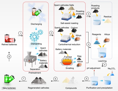 图6. 废LiFePO4正极材料火法冶金工艺示意图:LiFePO4正极的火法回收主要通过焙烧与熔融的方式提取金属产物,结合湿法浸出的方式提取单金属化合物。