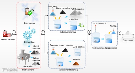 图5. 废LiFePO4正极材料湿法冶金工艺示意图:LiFePO4正极的湿法冶金回收方式主要将废旧电池拆解获得不同材料,通过多元素浸出或选择性浸出对金属进行提取。