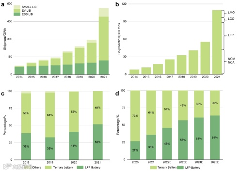 图 1. 锂离子电池、LiFePO4电池与正极材料的市场占比:LiFePO4电池装机量与正极材料的出货量占比大且逐年增加。