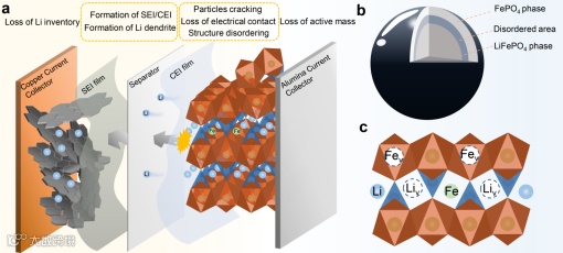 图4. LiFePO4正极材料的降解机制:LiFePO4正极材料的主要降解机制为锂含量的损失与活性物质的损失,锂含量损失主要由循环过程中副反应与锂沉积造成,活性物质损失主要由循环过程中颗粒裂纹、电接触及结构缺陷造成。