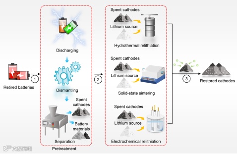 图7. 废LiFePO4正极材料直接再生工艺示意图:LiFePO4正极的直接再生主要通过水热、固相烧结与电化学法将锂元素补充至锂空位实现材料修复。