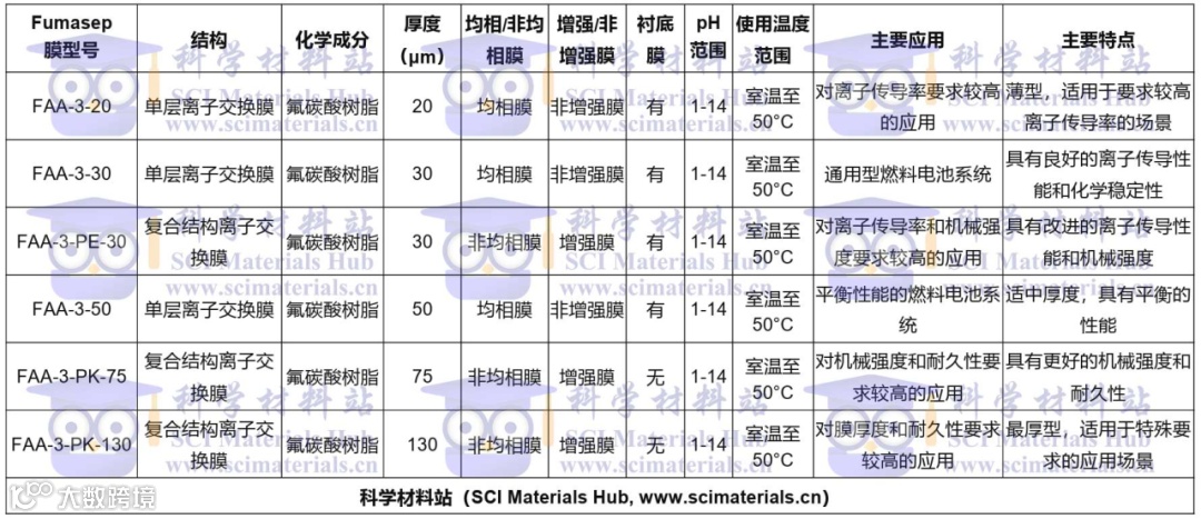 总的来说,Fumasep FAA-3系列离子交换膜在厚度、结构和性能方面有所差异,可以根据具体应用需求选择适合的产品。这些膜在燃料电池、电解水制氢、电化学分析、环境监测、药物制备等领域有广泛的应用。详细信息可参考科学材料站(SCI Materials Hub, www.scimaterials.cn)。